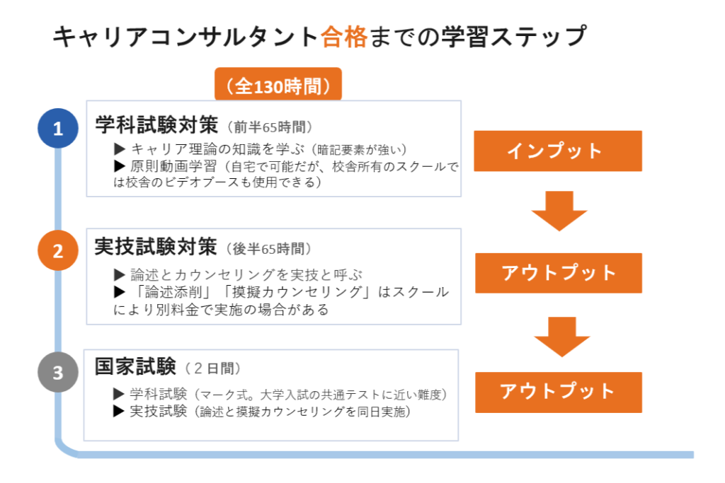 キャリアコンサルタントは、カウンセリングを学ぶという特質から、最低半分の65時間分はスクーリング(通学)で習う形をとることを、厚労省が定めています。そのため、キャリコンのスクールは、映像50%(学科試験対策)+通学50%(実技試験対策)が基本となっています。なお、実技とは面談だけではなく論述も含みます。