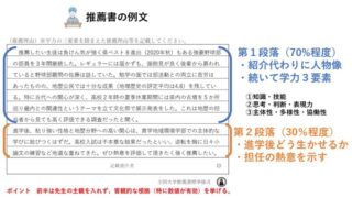 総合型選抜・学校推薦型(大学・短大・専門)【先生向け記事】大学入試「推薦書」の書き方・例文 このページでは、推薦書(大学・短大入試の学校推薦型選抜で必須)の書き方と例文を、高校の先生向けに説明します。受験生が、推薦書参考資料を作成するさいにもご利用ください。2025.10.18総合型選抜・学校推薦型(大学・短大・専門)