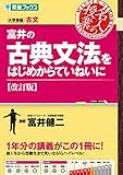 『富井の古典文法をはじめからていねいに』は、中3~高1前半レベルの古文の知識もあやふや、という人がターゲットです。例えば、四段や下二段の活用表を、1秒以内に自信を持って言い切れない人向けです。基礎から始める分、1冊でセンター試験対策は十分とまでは言えませんが、望月光先生の古典文法講義の実況中継を難しく感じる人には、おすすめです。