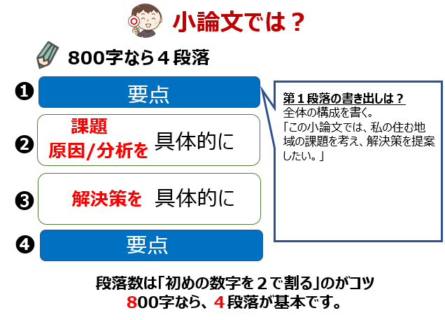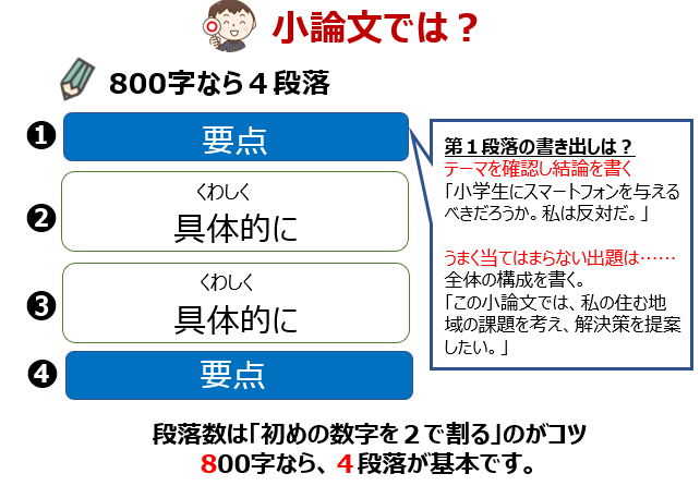 そして800字の小論文なら、要点→(くわしく)具体的に→(くわしく)具体的に→要点の4段落となります。初めの要点(第1段落)には、テーマと結論を書きます。出題によっては、全体の構成を説明した方が上手くいくこともあります。